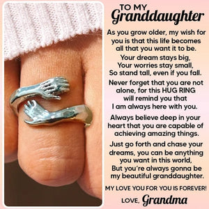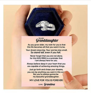 TO MY GRANDDAUGHTER, AS YOU GROW OLDER, MY WISH FOR YOU IS THAT THIS LIFE BECOMES ALL THAT YOU WANT IT TO BE. YOUR DREAM STAYS BIG, YOUR WORRIES STAY SMALL, SO STAND TALL, EVEN IF YOU FALL. NEVER FORGET THAT YOU ARE NOT ALONE, FOR THIS HUG RING IS A REMINDER THAT  I AM ALWAYS HERE FOR YOU. ALWAYS BELIEVE DEEP IN YOUR HEART THAT YOU ARE CAPABLE OF ACHIEVING AMAZING THINGS. JUST GO FORTH AND CHASE YOUR DREAMS, YOU CAN BE ANYTHING YOU WANT IN THIS WORLD, BUT YOU’RE ALWAYS GONNA BE MY BEAUTIFUL GRANDDAUGHTER.  MY LOVE FOR YOU IS FOREVER! LOVE, GRANDMA undefined