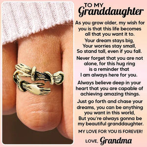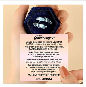 TO MY GRANDDAUGHTER, AS YOU GROW OLDER, MY WISH FOR YOU IS THAT THIS LIFE BECOMES ALL THAT YOU WANT IT TO BE. YOUR DREAM STAYS BIG, YOUR WORRIES STAY SMALL, SO STAND TALL, EVEN IF YOU FALL. NEVER FORGET THAT YOU ARE NOT ALONE, FOR THIS HUG RING IS A REMINDER THAT I AM ALWAYS HERE FOR YOU. ALWAYS BELIEVE DEEP IN YOUR HEART THAT YOU ARE CAPABLE OF ACHIEVING AMAZING THINGS. JUST GO FORTH AND CHASE YOUR DREAMS, YOU CAN BE ANYTHING YOU WANT IN THIS WORLD, BUT YOU’RE ALWAYS GONNA BE MY BEAUTIFUL GRANDDAUGHTER. MY LOVE FOR YOU IS FOREVER! LOVE, GRANDMA